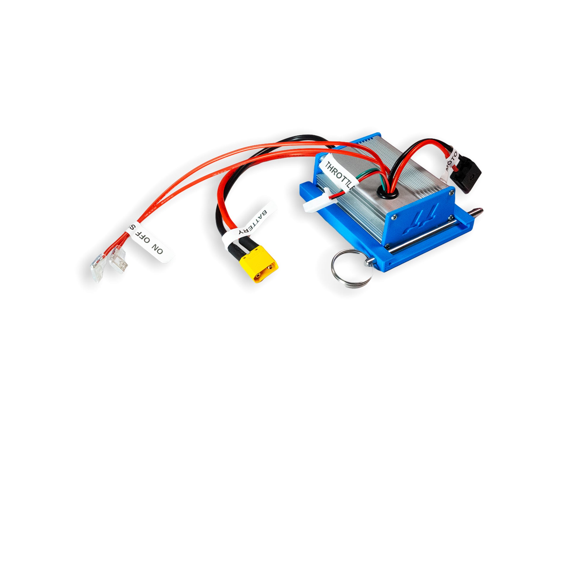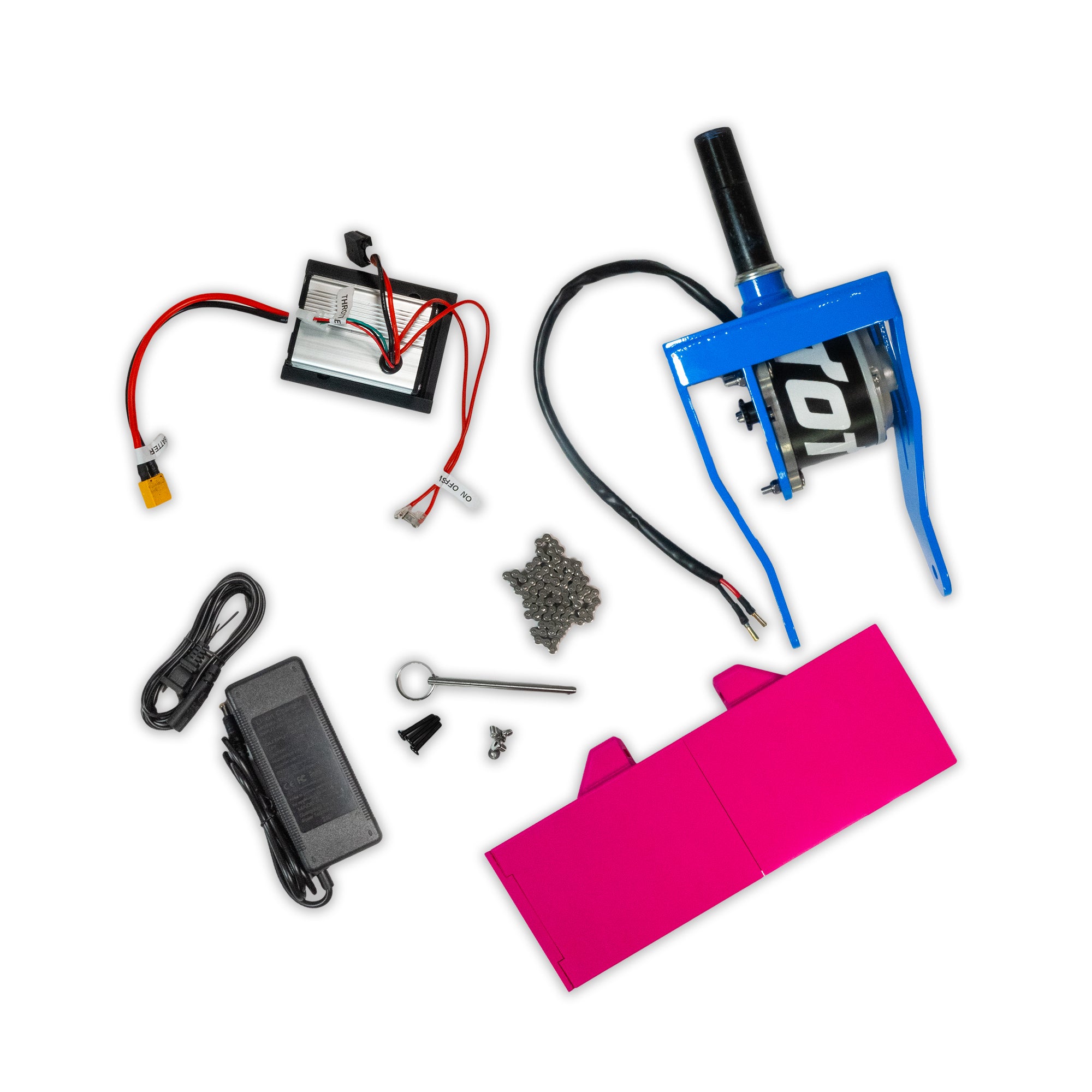 - 48v 1000w ESC w/ Mounting Plate - The brains of the operation. This bundle of aluminum, motherboard, and cables, connects to your throttle and takes the power from your battery and sends it straight to the 900w motor. You also get the mount so you can attach to your steering column.